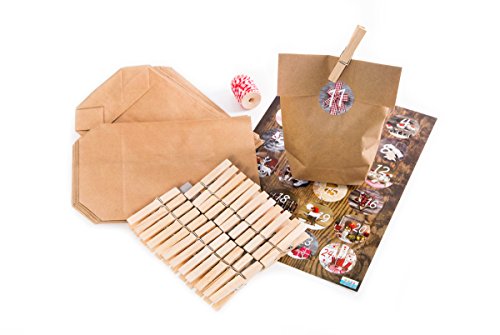 Calendrier de l'avent à monter avec chiffres-adhésifs, grandes pinces à linge rouge power blanc of parfumes ficelle (15 m) pour suspendre et kreuzboden papierbeuteln - 24