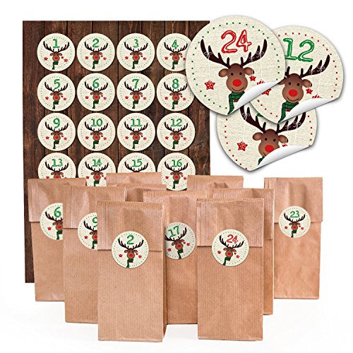 '24 sacs en papier brun avec tapis de sol avec feuillets (7 x 4 x 20,5 cm) et 24 ronds cm 4 autocollants Cerf pour les enfants pour un superbe calendrier de l'avent à remplir soi-même bricolage?; 1 A qualité.