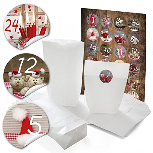 '96 sachets en papier de Noël (14 x 22 x 5,6 cm) blanche et 96 autocollants rondes 4 cm "calendrier de l'avent autocollants chiffres 1 à 24 pour superbe calendrier de l'avent à elle-même pour bricoler - 1 A qualité.