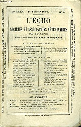 R240108318. L'ECHO DES SOCIETES ET ASSOCIATIONS VETERINAIRES DE FRANCE Février 1880 - Des causes de la bénignité des inoculations virulentes préventives * De la situation dans l'armée des vétérinaires simples soldats.... 1880. In-8. Broché. Etat d'usage, Couv. convenable, Dos satisfaisant, Intérieur frais. paginé de 66 à 144 - rares illustrations noir et blanc dans le texte - 2 photos disponibles dont Sommaire. . . . Classification Dewey : 636.089-Art vétérinaire